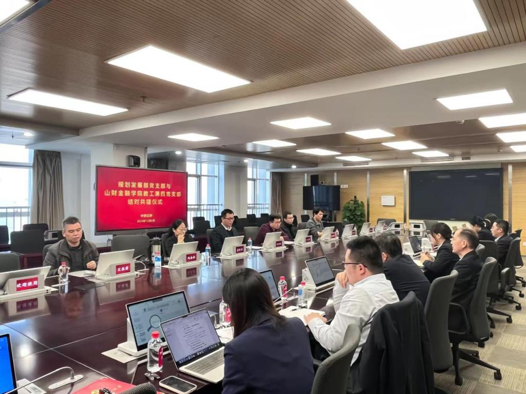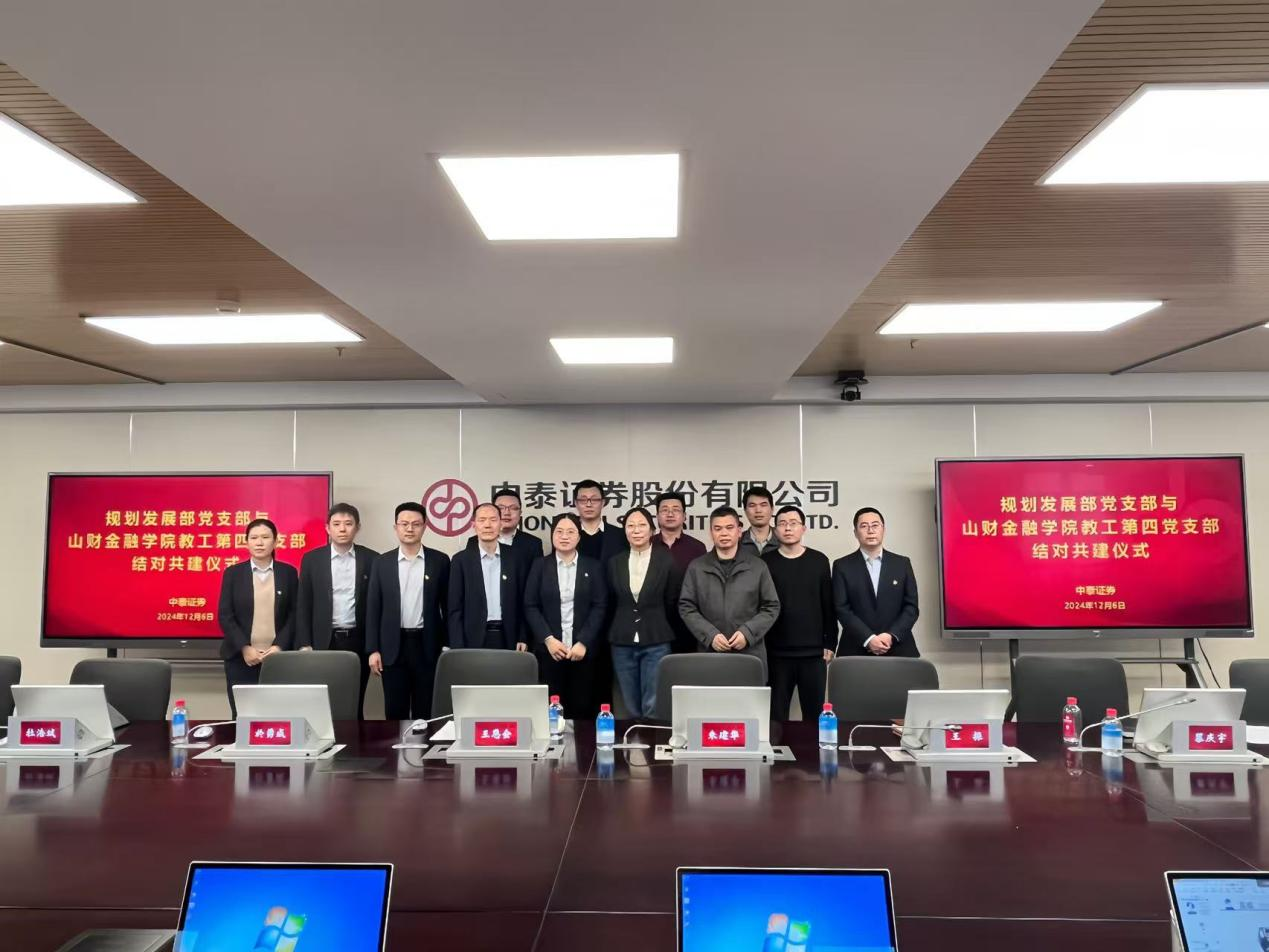 为深入学习贯彻党的二十届三中全会精神,全面落实新时代党的建设总要求,12月6日,金融学院教工第四党支部与中泰证券规划发展部党支部在中泰证券总部开展“党建共建促发展,业务共研聚合力”党建共建活动。山东财经大学金融学院教工第四党支部党员代表和中泰证券规划发展部党支部部分党员参加座谈会。