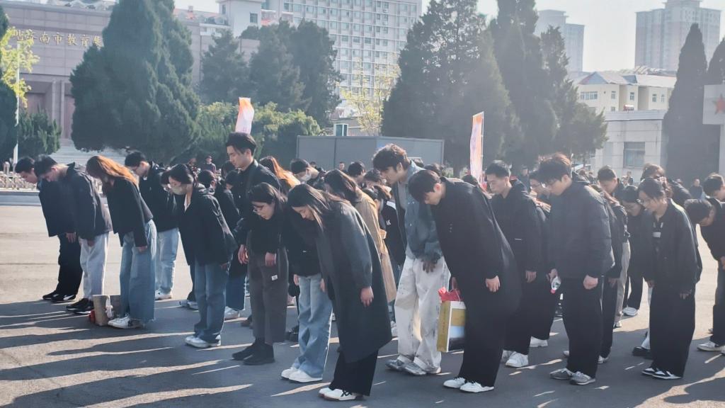 宣誓结束后,同学们缓步至烈士墓前,肃立鞠躬,向为民族独立和人民解放献出生命的英烈致以深切哀思。最后,全体人员面向革命主题浮雕鞠躬默哀,以无声的敬意缅怀先烈丰功伟绩。