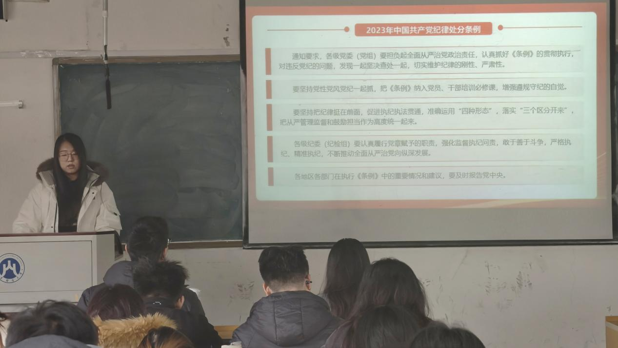 纪律严明是党的光荣传统和独特优势,是管党治党的重要基础性法规。为深入贯彻落实习近平总书记关于全面加强党的纪律建设的重要指示精神,引导新发展党员深刻领会《中国共产党纪律处分条例》(以下简称《条例》)的核心要义,切实扣好入党后的“第一粒扣子”,12月11日下午,金融学院“青语新声”研究生理论学习宣讲团以“学条例、知敬畏、守底线”为主题,在山东财经大学舜耕校区6217教室开展专题宣讲活动。学院新发展党员参加此次活动。